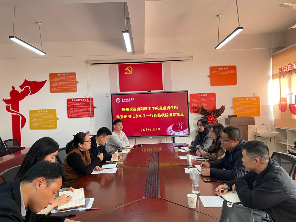 11月4日下午,南阳理工学院范蠡商学院党委副书记李冬生一行4人到我院进行考察交流。双方在和钧楼219会议室举行了座谈,我院党委副书记杜艳娇、全体辅导员参加座谈,会议由党委副书记杜艳娇主持。